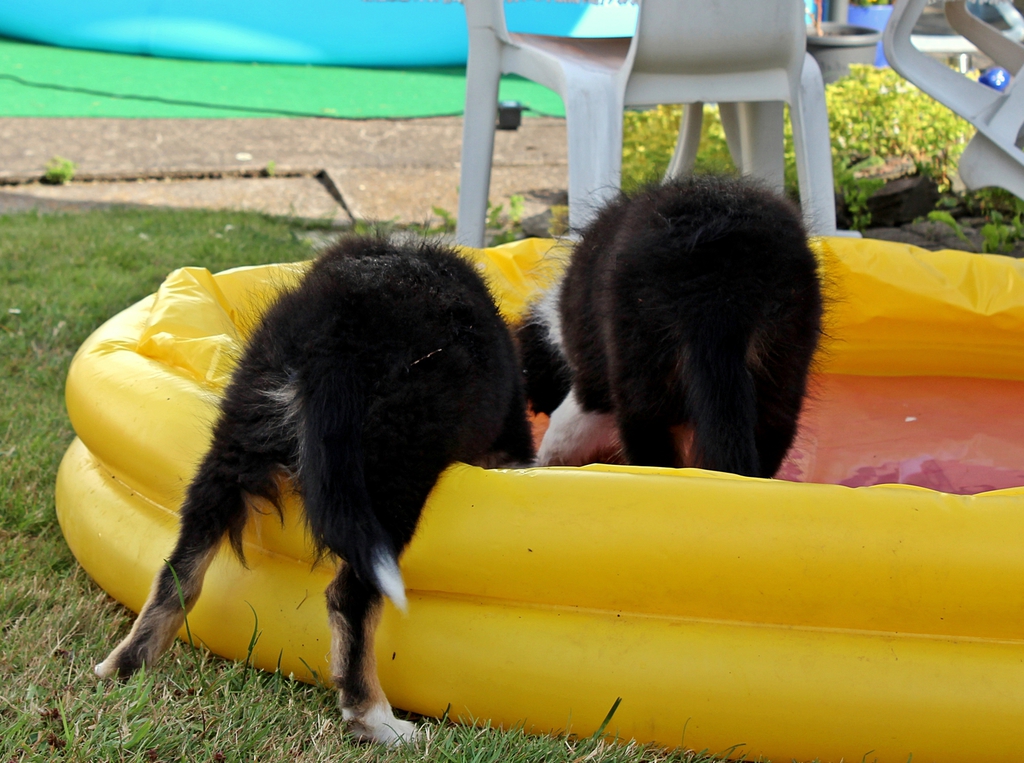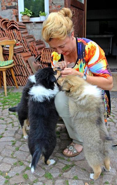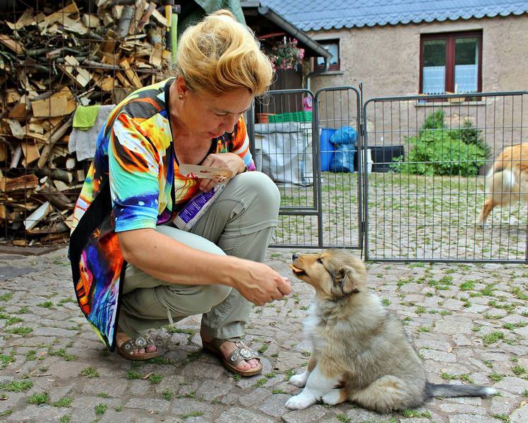 Heute war ein ereignisreicher Tag für die Welpen. Erst kam Kerstin Haupt (Zuchtwart) zur Wurfabnahme. Alle Welpen sind wohl auf und entsprechen ihrem Alter nach den Zuchtbestimmungen.