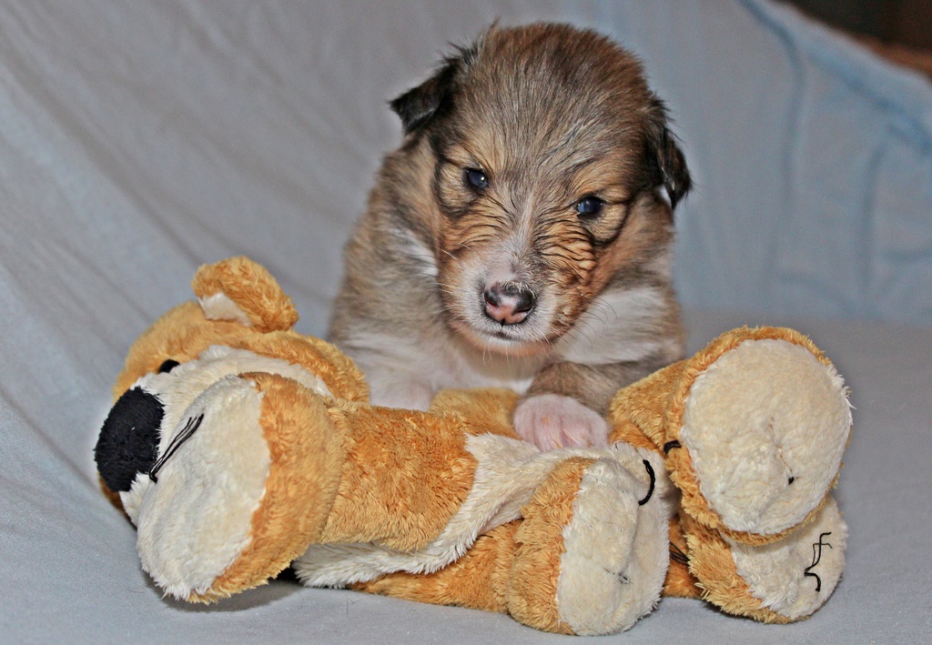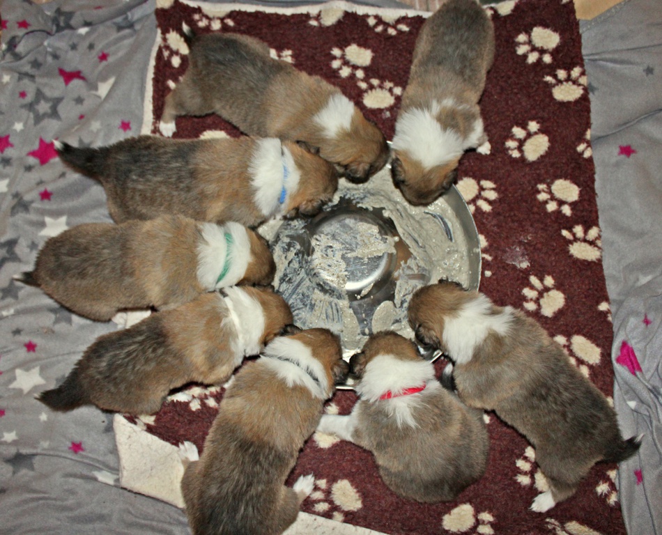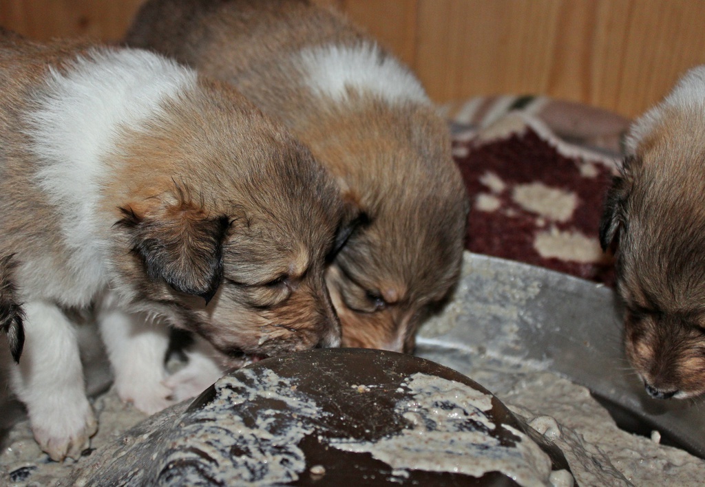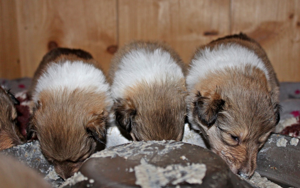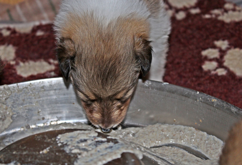 Wie man sieht der Welpenbrei schmeckt! Seit 3 Tagen bekommen unsere Welpen früh und abend zusätzlich einen Brei aus Welpenmilch und eingeweichten Welpenfutter serviert. So erlernen die Welpen das fressen aus dem Napf und Ilka ist etwas entlastet von der Rasselbande. Mittlerweile klappt es schon ganz gut mit der Tischordnung, sodass keine Welpen mehr im Futternapf stehen oder liegen. ;-)