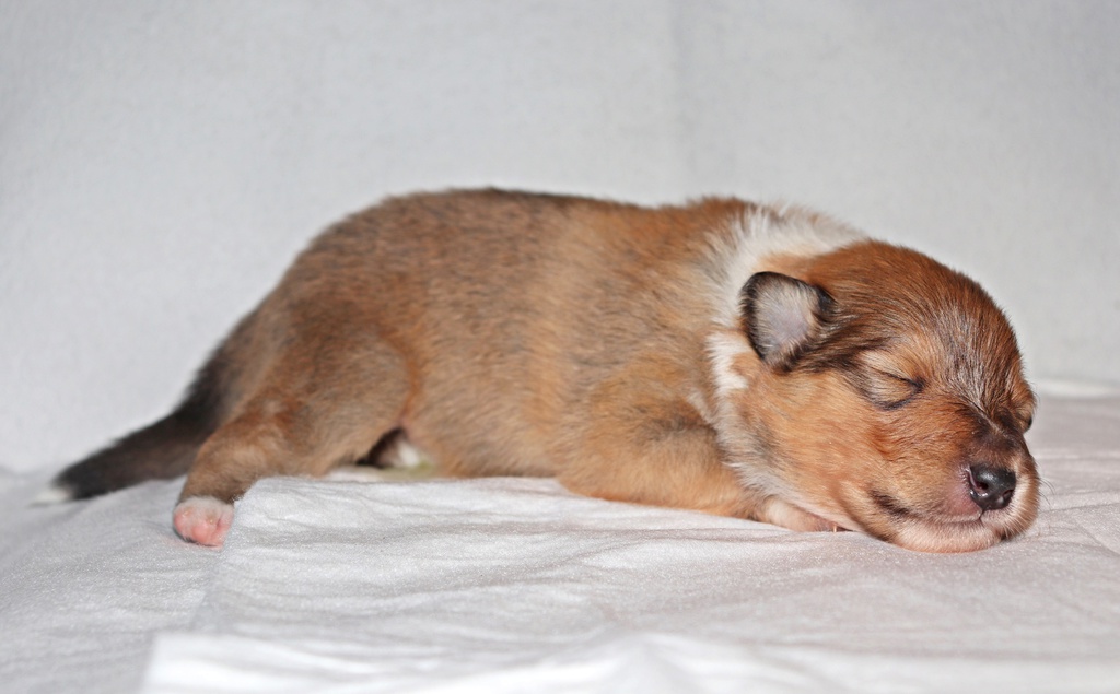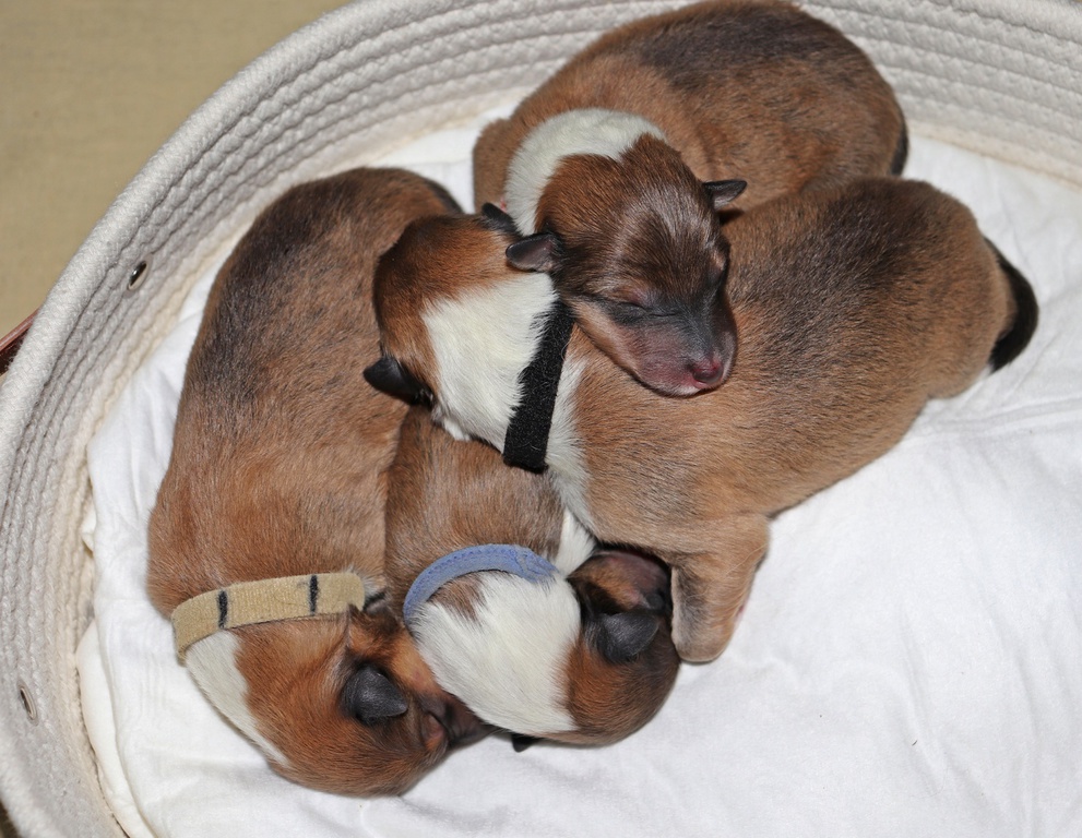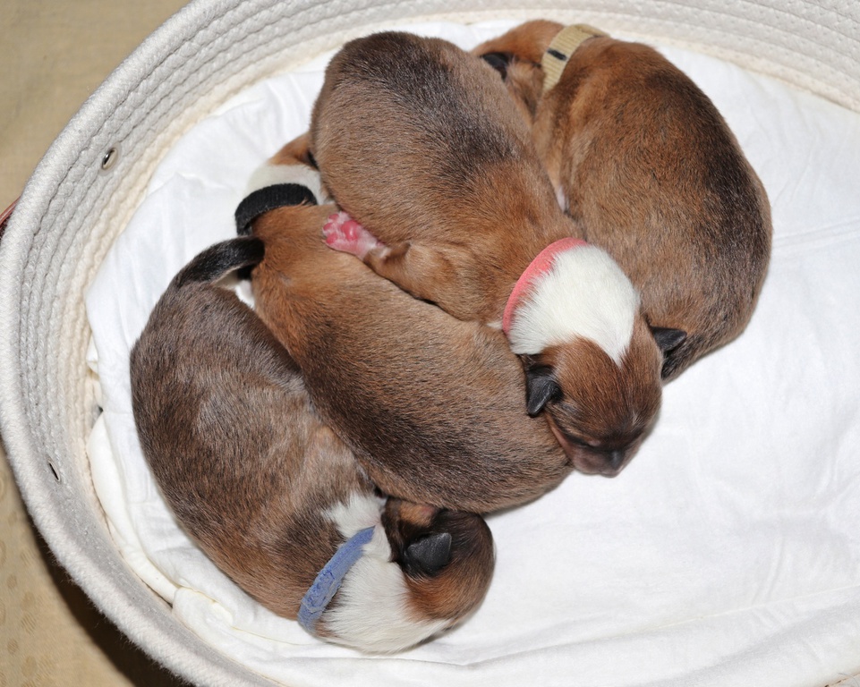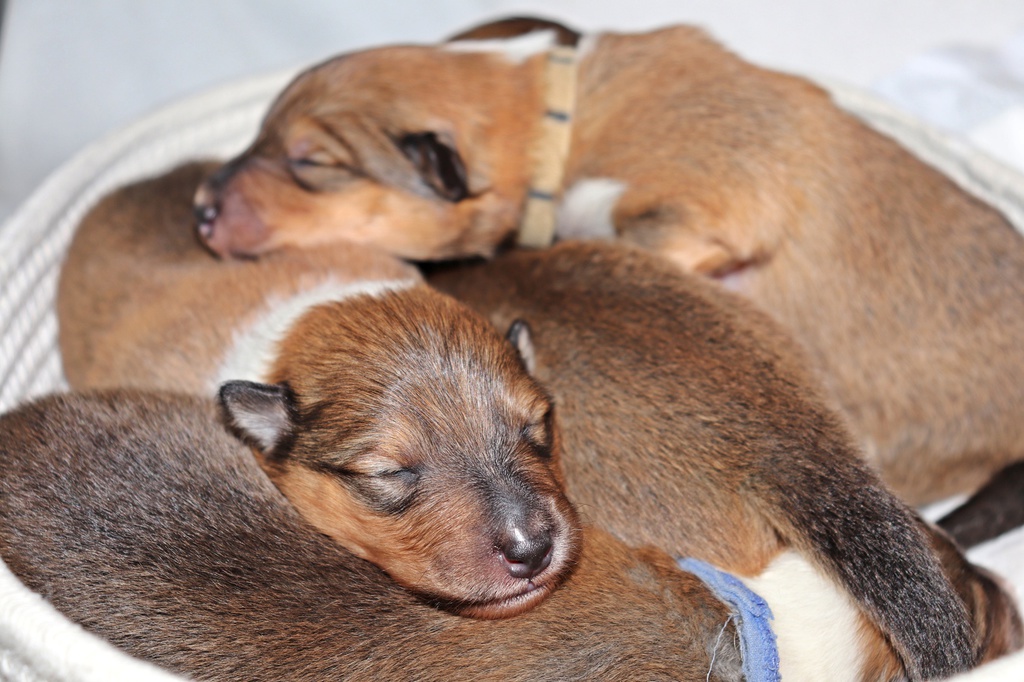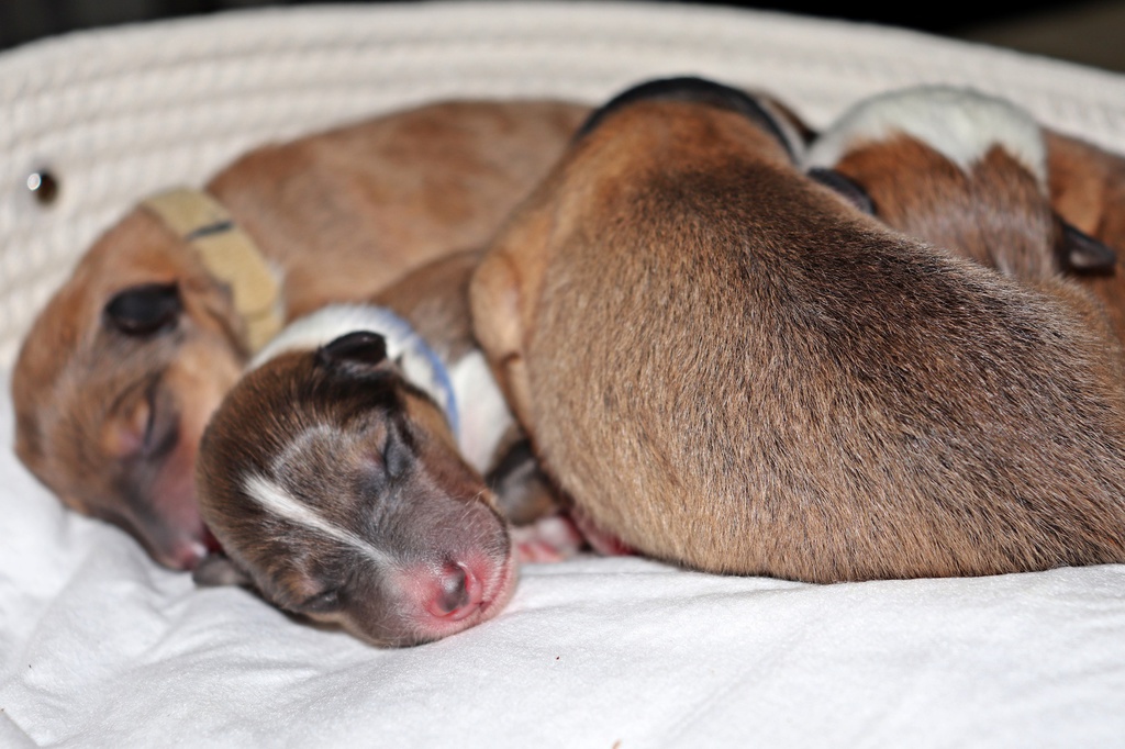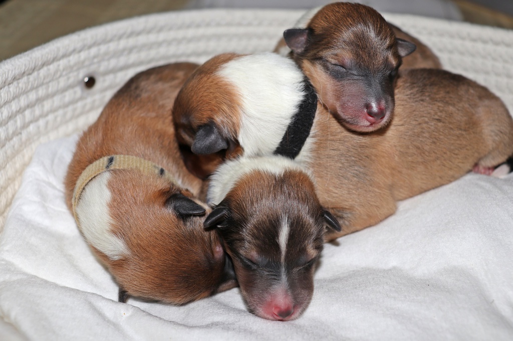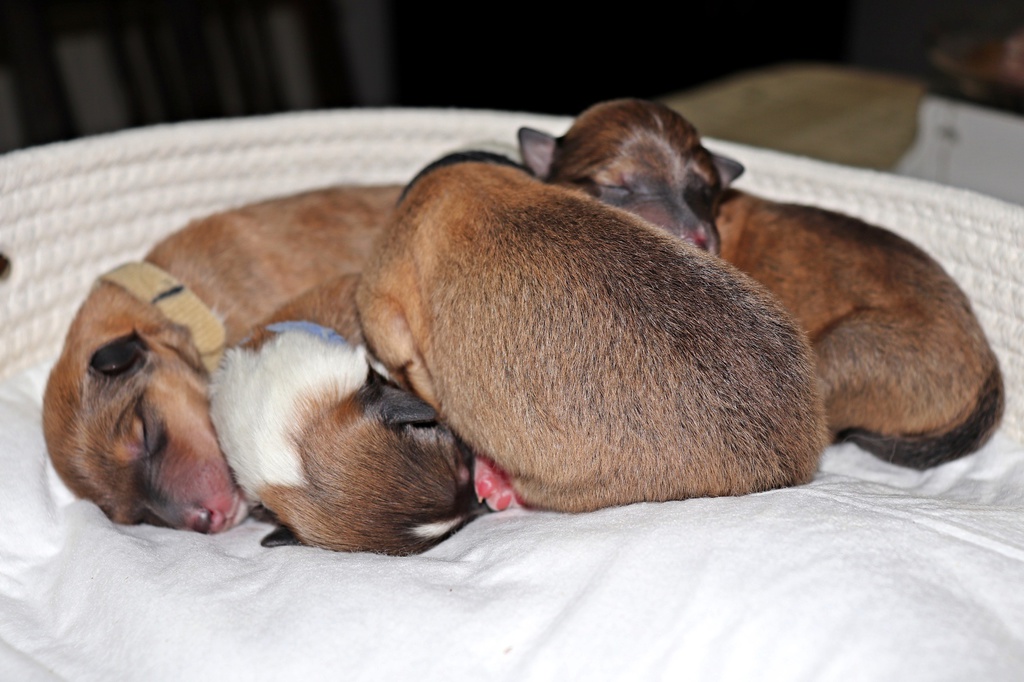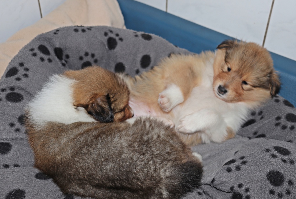 Mittlerweile haben die Welpen kräftig zugenommen und wiegen zwischen 820 und 1040 Gramm. Auch die Augen öffnen sich allmählich und erste erste taumelige Gehversuche werden in der Wurfkiste unternommen. Ihre Mama Ary hat sich vollständig vom Kaiserschnitt erholt und kümmert sich liebevoll um ihre Fellkinder.