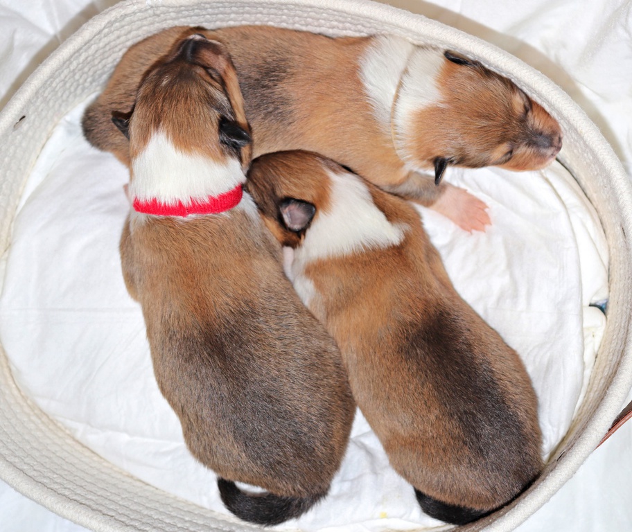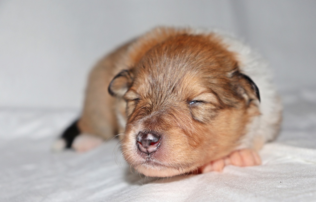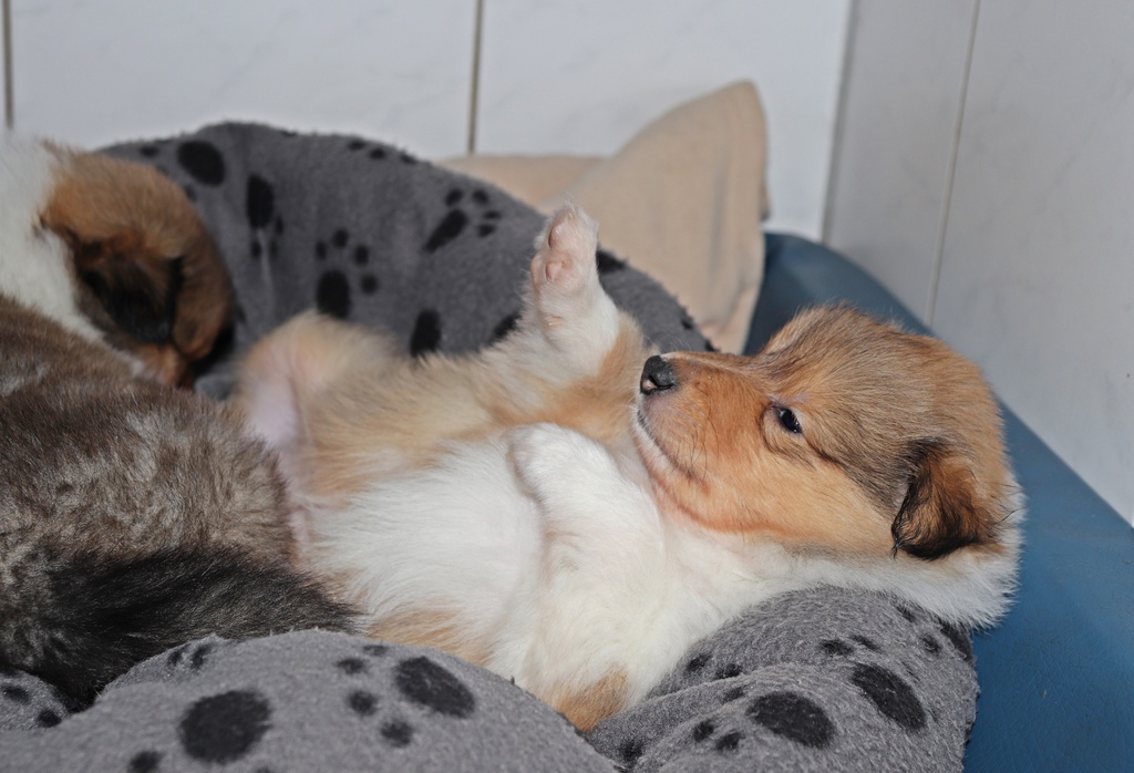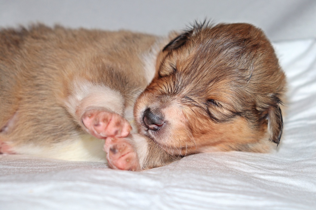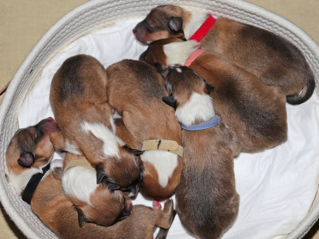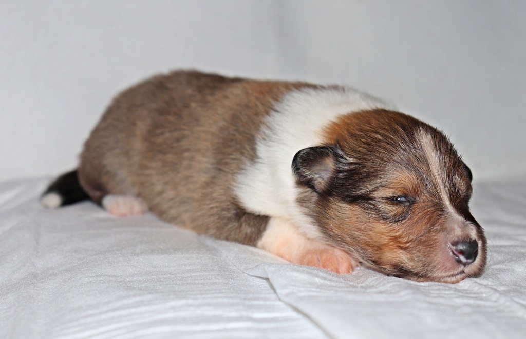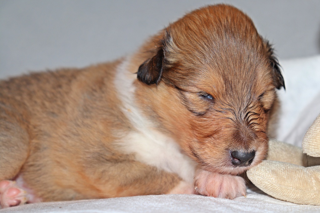 Mittlerweile haben die Welpen kräftig zugenommen und wiegen zwischen 820 und 1040 Gramm. Auch die Augen öffnen sich allmählich und erste erste taumelige Gehversuche werden in der Wurfkiste unternommen. Ihre Mama Ary hat sich vollständig vom Kaiserschnitt erholt und kümmert sich liebevoll um ihre Fellkinder.
