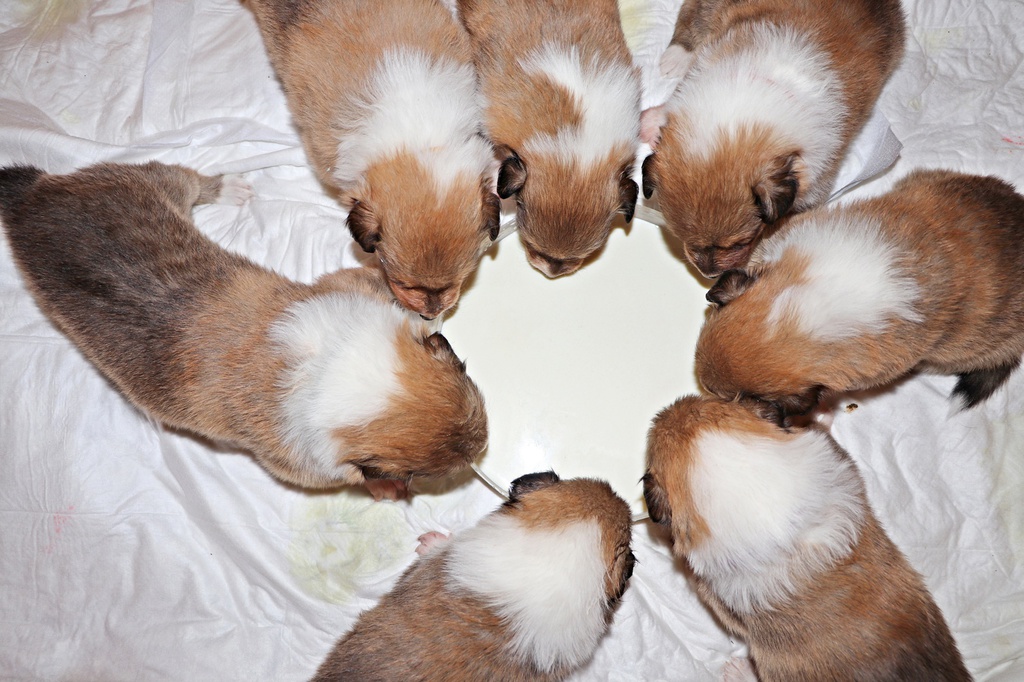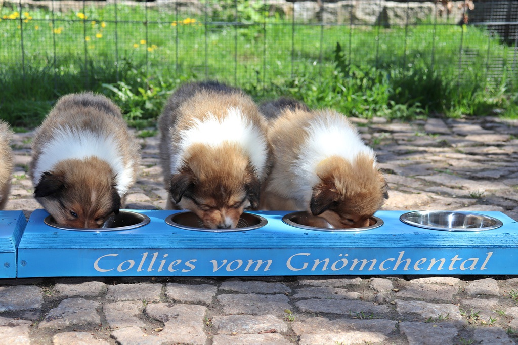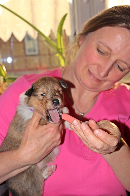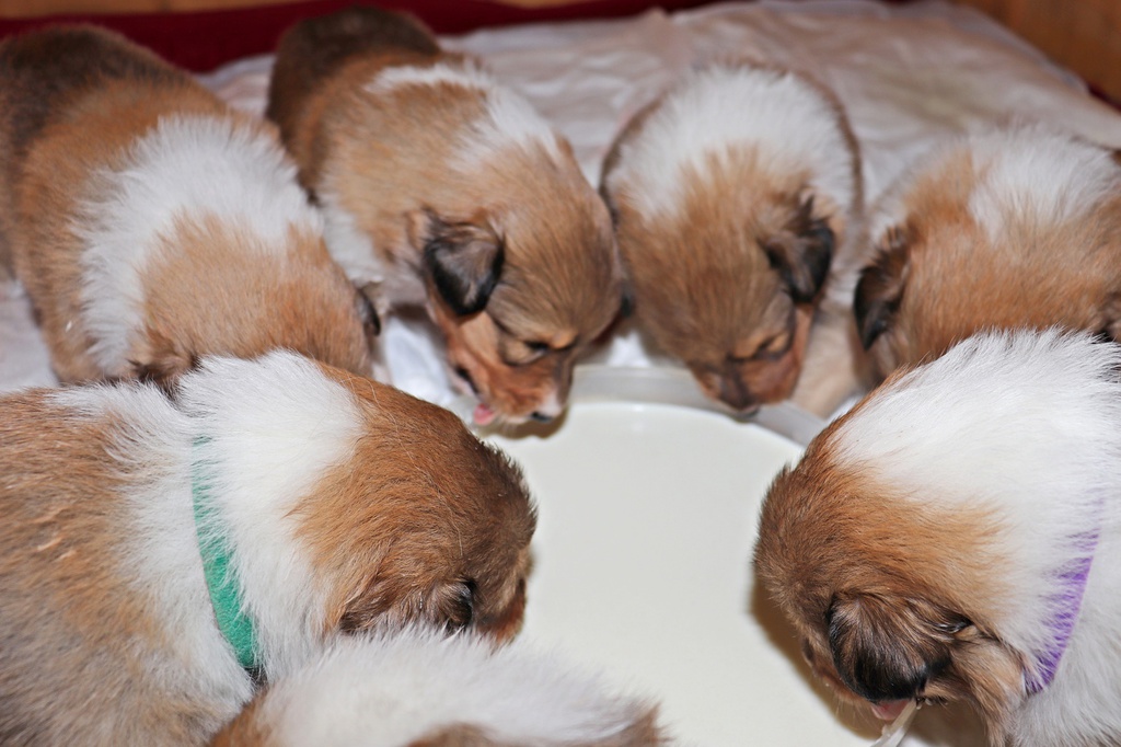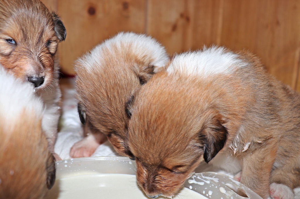 Heute gab es die erste Wurmkur für die Welpen, begeistert waren sie davon nicht, aber als Entschädigung gab es im Anschluss ein leckeres Breichen. Wir füttern die Welpen jetzt allmählich zu, damit Ary ein bisschen entlastet ist von ihren Mutterpflichten. Bei den ersten Versuchen aus dem Napf zu schlecken, nahmen die Welpen noch ein "Milchbad", mittlerweile klappt es immer besser.
