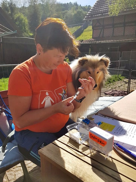Heute war unsere Tierärztin Sylvie Lindisch bei den Welpen zum impfen, chipen und zur allgemeinen Gesundheitsuntersuchung da. Die Welpen waren alle tapfer und wurden mit Leckerchen vom Geschehen abgelenkt. Ausserdem hat Halbschwester Dacota alles im Blick gehabt das den Welpen nichts passiert. Nun steht nichts mehr im Wege das die Welpen bald in ihr neues Zuhause umziehen können.