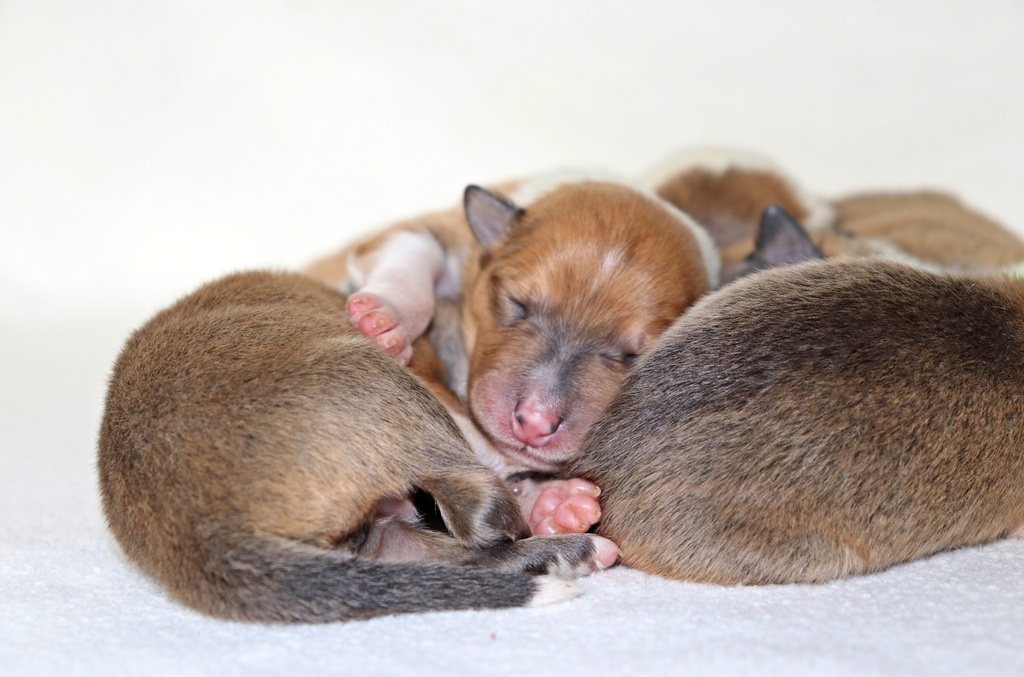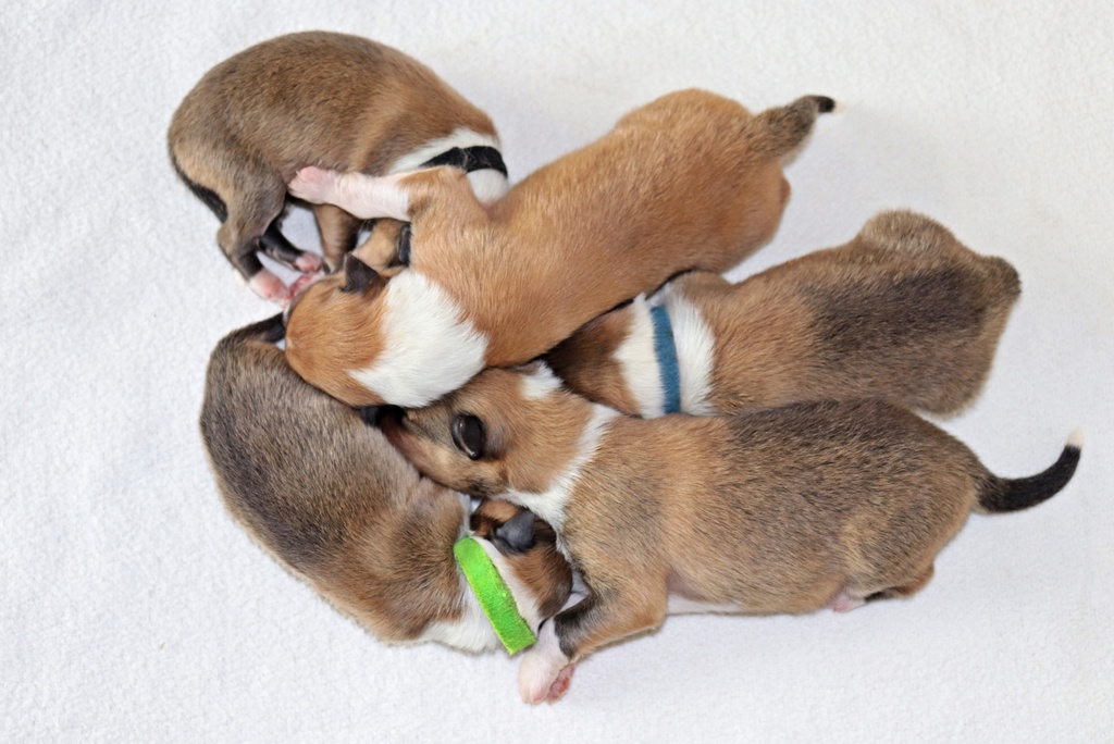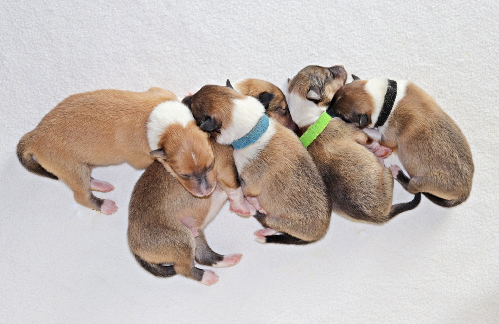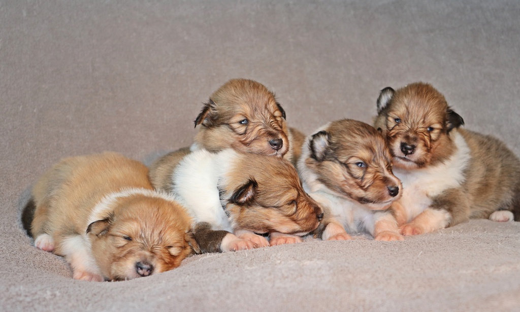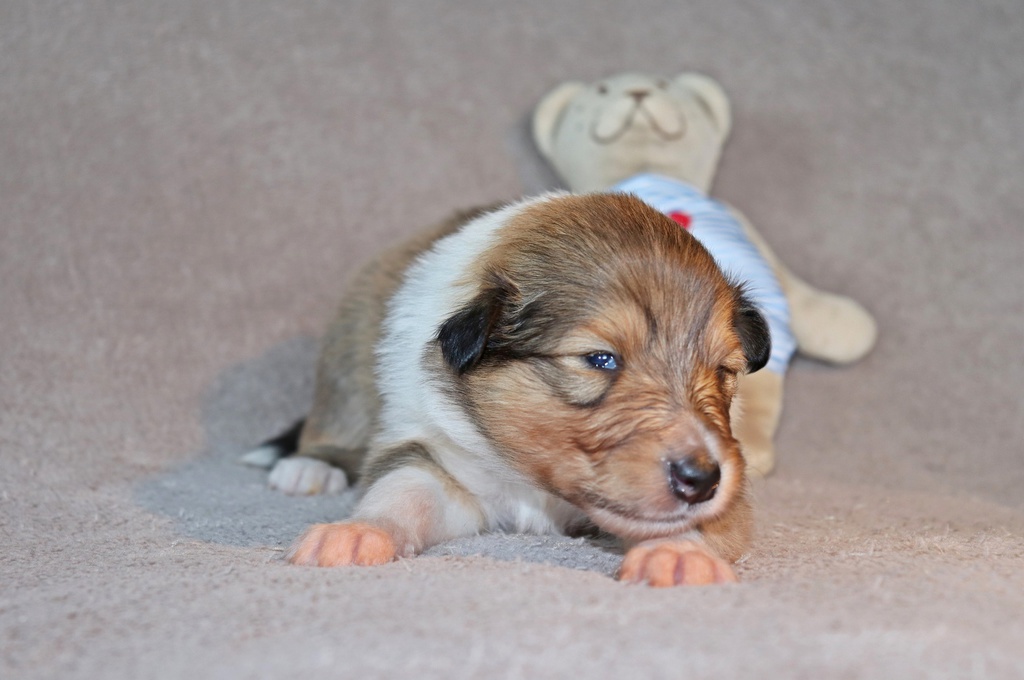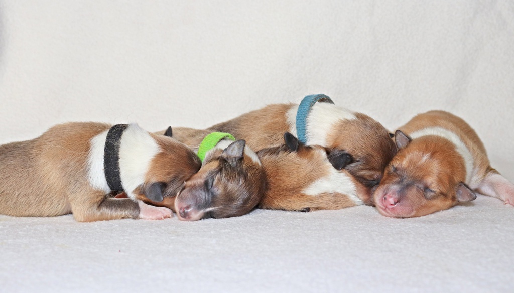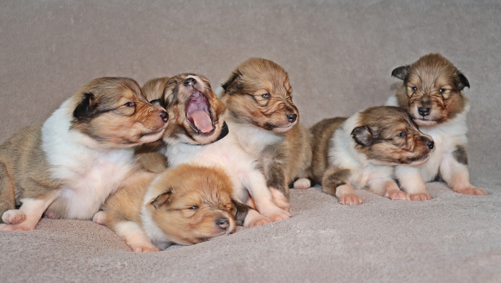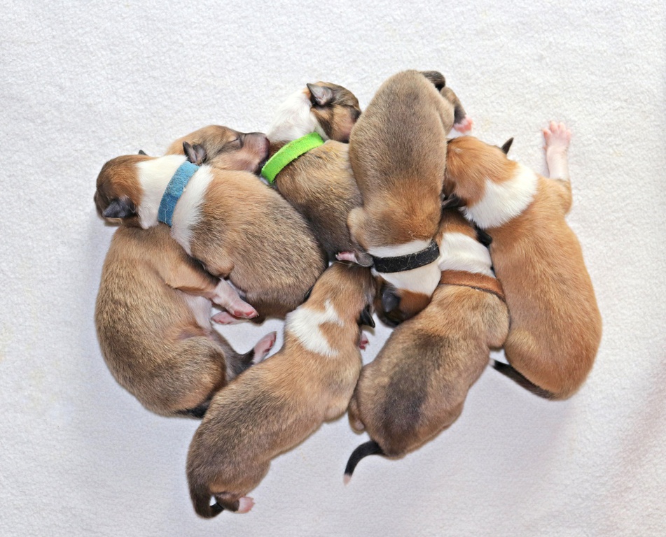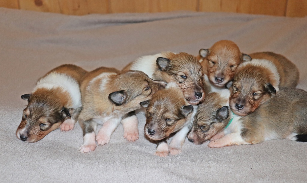 Nun sind die Welpen schon 2 Wochen alt und so langsam öffnen sich die Äuglein. Sie sind auch sehr mobil im erkunden der Wurfkiste und haben ihr Geburtsgewicht mehr als verdoppelt. Mama Dacota hat ihre Rasselbande gut im Griff. ;-)