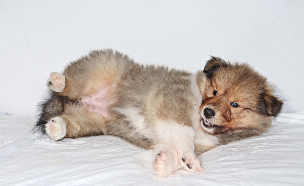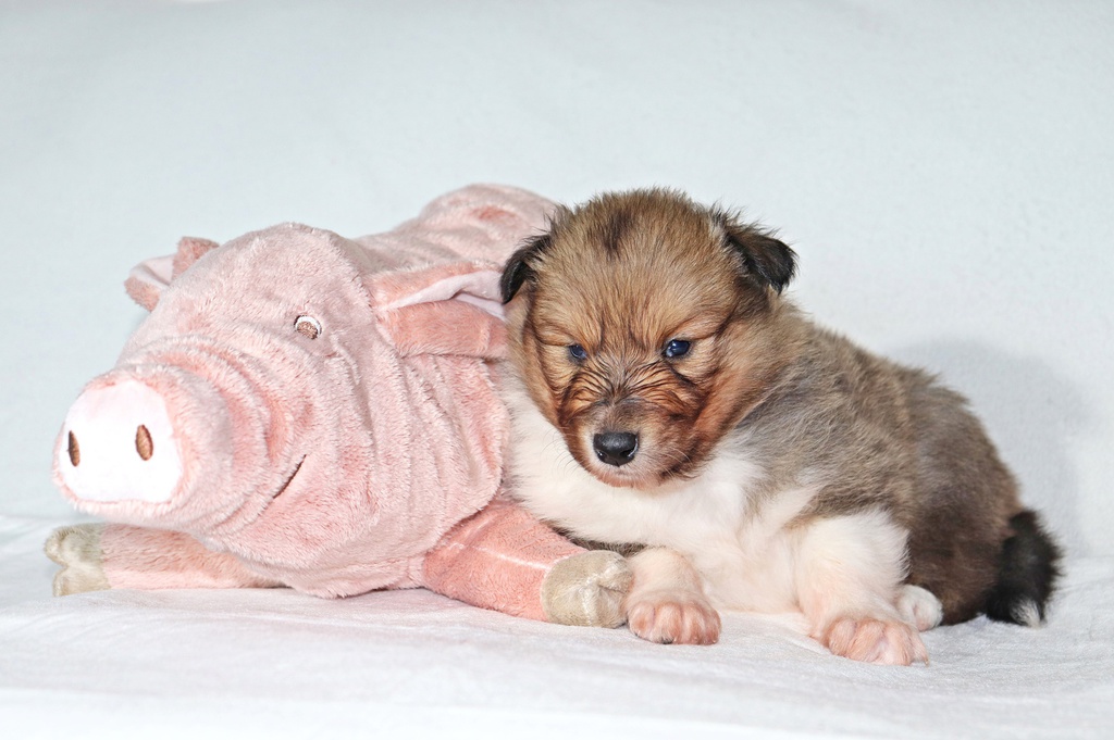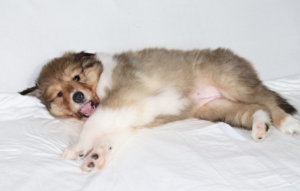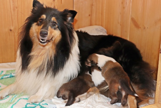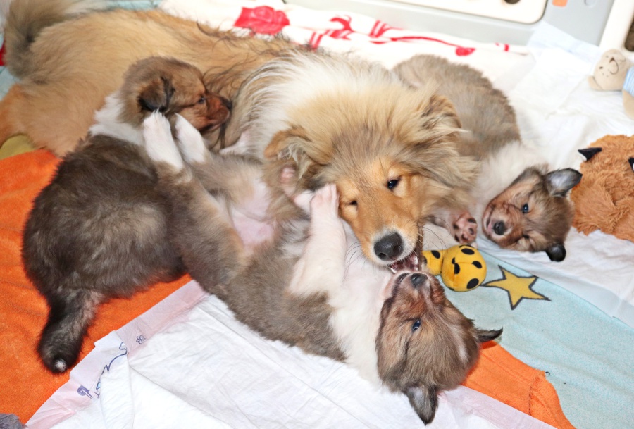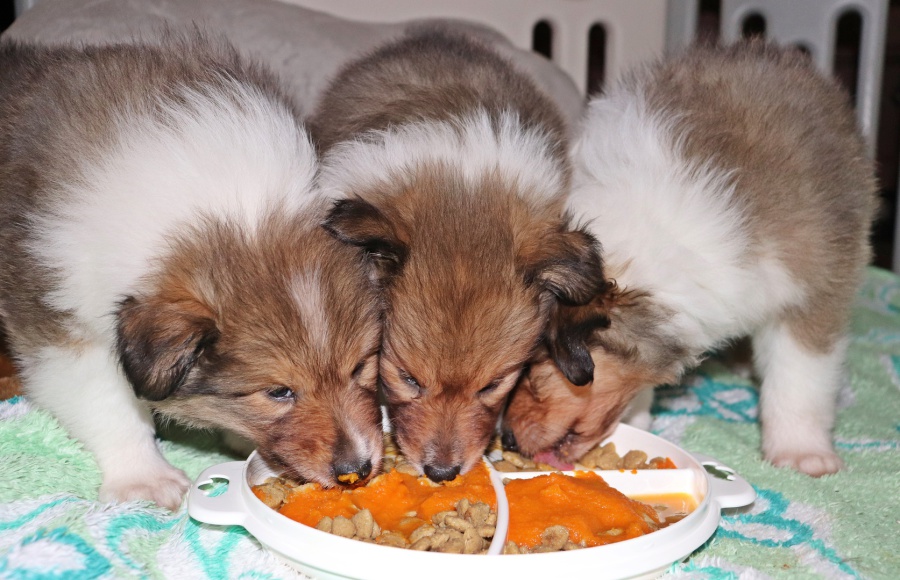 Nochmal stärken vor dem Umzug in den Außenbereich. Morgen ziehen die Welpen runter auf den Hof ins Welpenzimmer mit Auslauf. Mittlerweile fressen die Welpen selbstständig und es schmeckt wie man sieht. Sie bringen jetzt über 2 Kg auf die Waage.